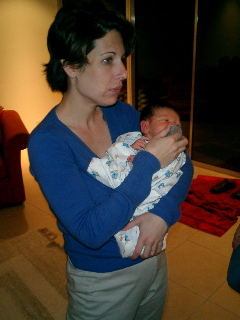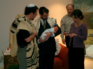 Stephen, the Rabbi, Sam, Jack, and Jessica at the Bris. Poor guy.