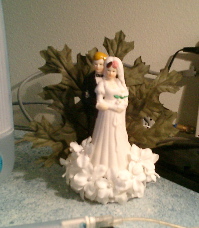 I think it turned out quite well. I mixed model paint to get the color of Austin's hair, since the first thing he said about the original topper was "but I don't have brown hair." I told him I'd just have to find another groom then. Repainting was a little easier in the long run. Except for a second-degree burn with the glue gun, this is a project that went pretty well.
